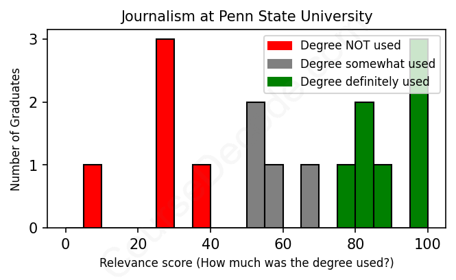 The verdict? Below average. Overall, with an average relevance score of 61%, Journalism graduates from Penn State University have a lower likelihood (-6%) of finding work in this field compared to the average graduate across all fields: