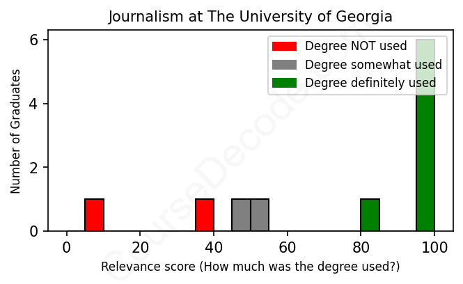The verdict? Above average. Overall, with an average relevance score of 74%, Journalism graduates from The University of Georgia have a higher likelihood (+7%) of finding work in this field compared to the average graduate across all fields: