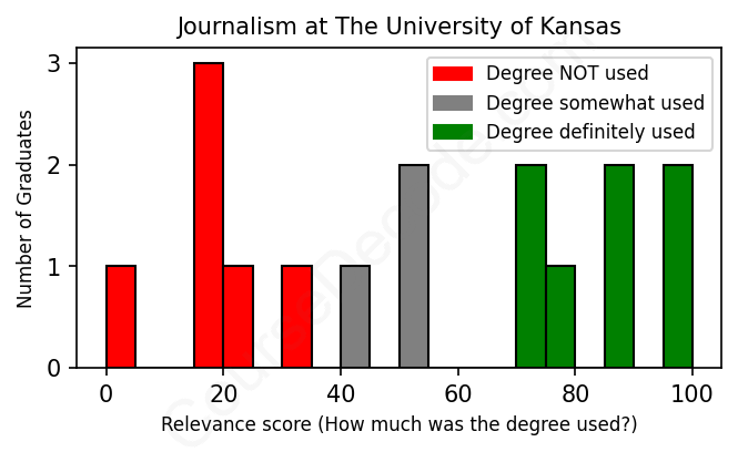 The verdict? Significantly below average. Overall, with an average relevance score of 52%, Journalism graduates from The University of Kansas have a much lower likelihood (-15%) of finding work in this field compared to the average graduate across all fields: