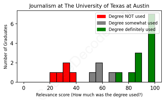The verdict? Slightly above average. Overall, with an average relevance score of 70%, Journalism graduates from The University of Texas at Austin have a slightly higher likelihood (+3%) of finding work in this field compared to the average graduate across all fields: