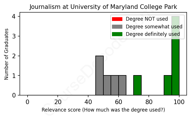 The verdict? Above average. Overall, with an average relevance score of 75%, Journalism graduates from University of Maryland College Park have a higher likelihood (+8%) of finding work in this field compared to the average graduate across all fields: