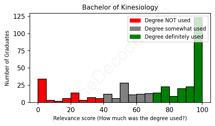 The verdict? On par with the average. Overall, with an average relevance score of 67%, Kinesiology graduates have about the same likelihood of finding work in this field as the average graduate across all fields: