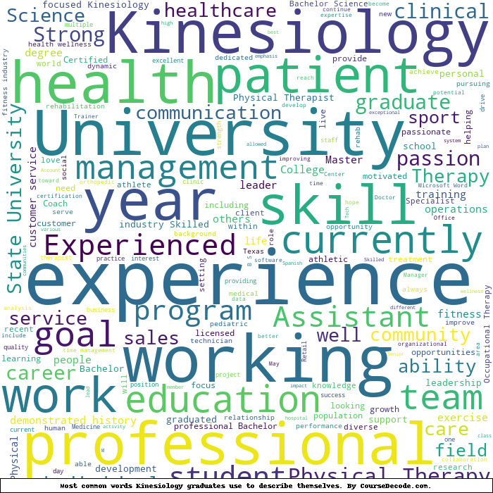 Here is a visual representation of the most common words seen in the "about" section of LinkedIn profiles who have a Bachelor degree in Kinesiology. This may or may not be useful: