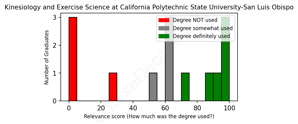 The verdict? Below average. Overall, with an average relevance score of 58%, Kinesiology and Exercise Science graduates from California Polytechnic State University-San Luis Obispo have a lower likelihood (-9%) of finding work in this field compared to the average graduate across all fields: