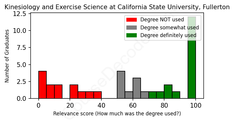 The verdict? Below average. Overall, with an average relevance score of 58%, Kinesiology and Exercise Science graduates from California State University, Fullerton have a lower likelihood (-9%) of finding work in this field compared to the average graduate across all fields: