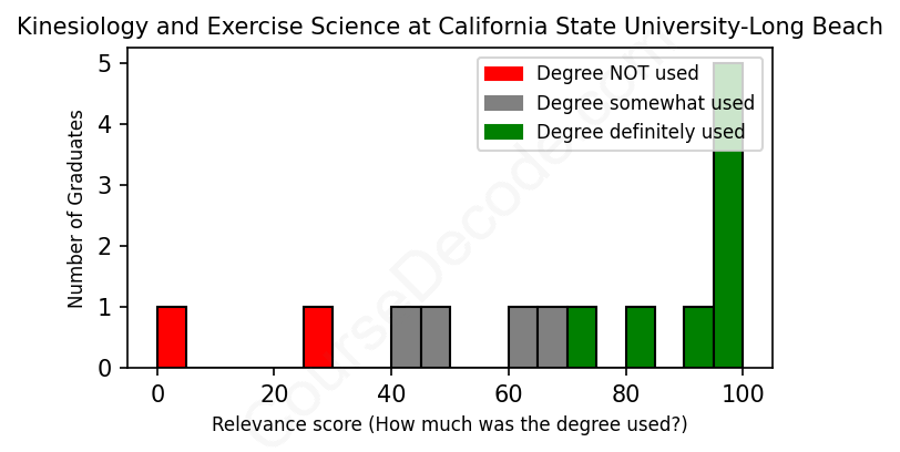 The verdict? Slightly above average. Overall, with an average relevance score of 70%, Kinesiology and Exercise Science graduates from California State University-Long Beach have a slightly higher likelihood (+3%) of finding work in this field compared to the average graduate across all fields: