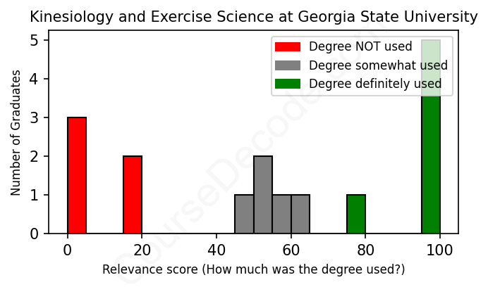 The verdict? Significantly below average. Overall, with an average relevance score of 54%, Kinesiology and Exercise Science graduates from Georgia State University have a much lower likelihood (-13%) of finding work in this field compared to the average graduate across all fields: