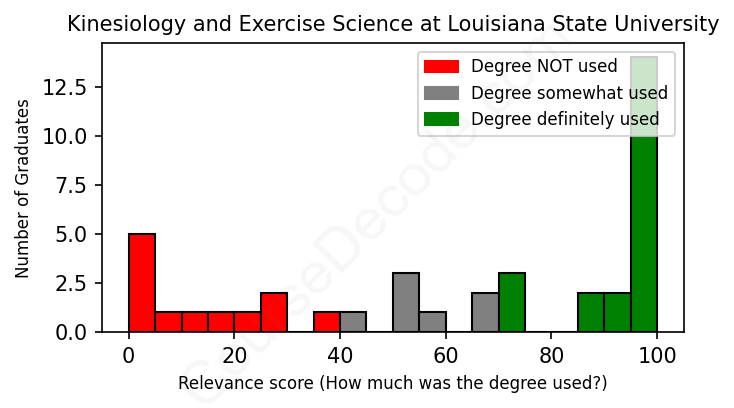 The verdict? Slightly below average. Overall, with an average relevance score of 62%, Kinesiology and Exercise Science graduates from Louisiana State University have a slightly lower likelihood (-5%) of finding work in this field compared to the average graduate across all fields: