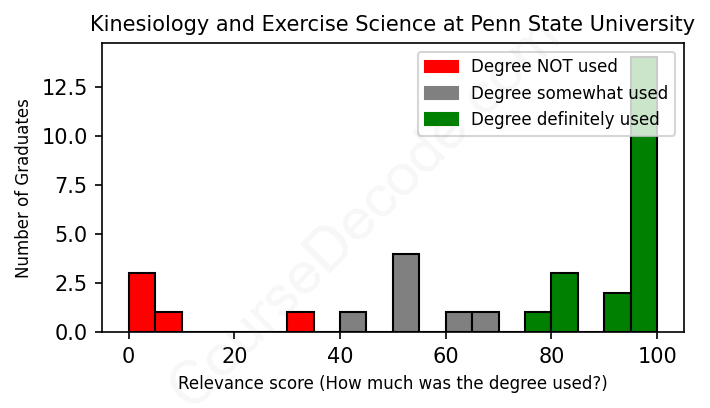 The verdict? Slightly above average. Overall, with an average relevance score of 72%, Kinesiology and Exercise Science graduates from Penn State University have a slightly higher likelihood (+5%) of finding work in this field compared to the average graduate across all fields: