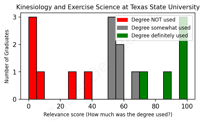 The verdict? Significantly below average. Overall, with an average relevance score of 51%, Kinesiology and Exercise Science graduates from Texas State University have a much lower likelihood (-16%) of finding work in this field compared to the average graduate across all fields: