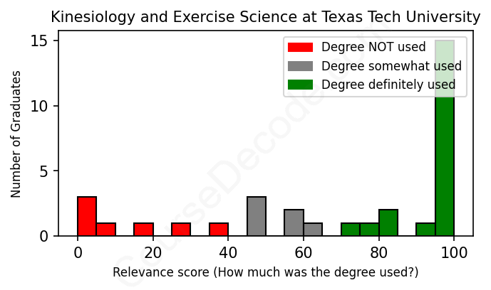 The verdict? Slightly above average. Overall, with an average relevance score of 70%, Kinesiology and Exercise Science graduates from Texas Tech University have a slightly higher likelihood (+3%) of finding work in this field compared to the average graduate across all fields: