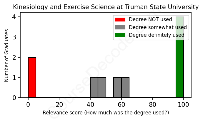 The verdict? Below average. Overall, with an average relevance score of 60%, Kinesiology and Exercise Science graduates from Truman State University have a lower likelihood (-7%) of finding work in this field compared to the average graduate across all fields: