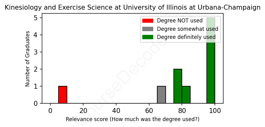 The verdict? Significantly above average. Overall, with an average relevance score of 80%, Kinesiology and Exercise Science graduates from University of Illinois at Urbana-Champaign have a much higher likelihood (+13%) of finding work in this field compared to the average graduate across all fields: