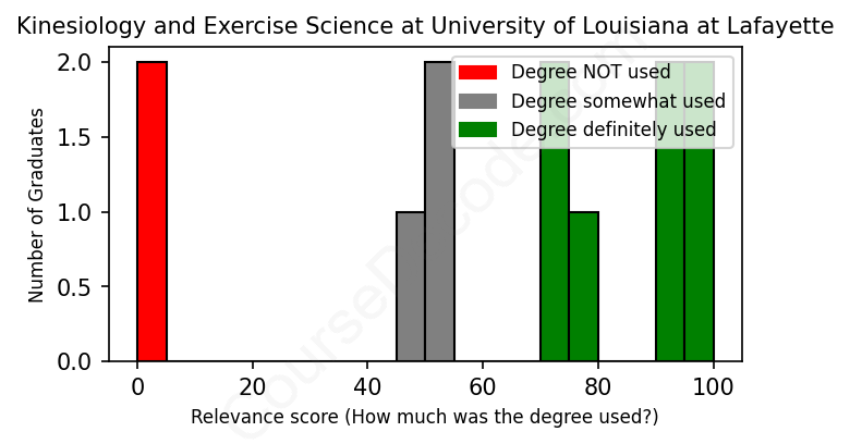 The verdict? Slightly below average. Overall, with an average relevance score of 62%, Kinesiology and Exercise Science graduates from University of Louisiana at Lafayette have a slightly lower likelihood (-5%) of finding work in this field compared to the average graduate across all fields: