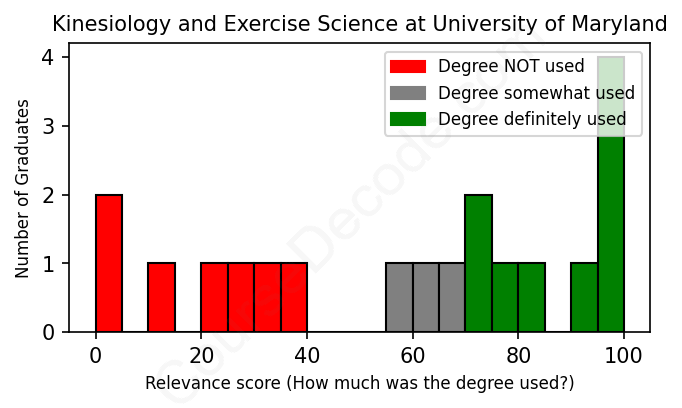 The verdict? Below average. Overall, with an average relevance score of 58%, Kinesiology and Exercise Science graduates from University of Maryland have a lower likelihood (-9%) of finding work in this field compared to the average graduate across all fields: