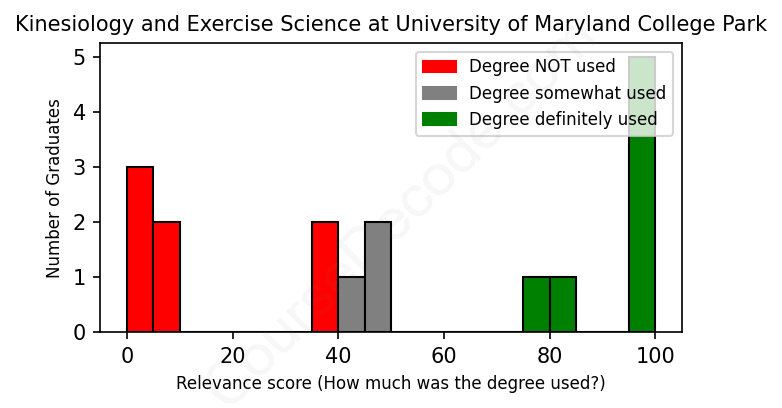 The verdict? Significantly below average. Overall, with an average relevance score of 52%, Kinesiology and Exercise Science graduates from University of Maryland College Park have a much lower likelihood (-15%) of finding work in this field compared to the average graduate across all fields: