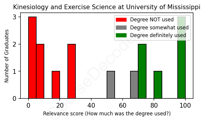 The verdict? Bad. Overall, with an average relevance score of 45%, Kinesiology and Exercise Science graduates from University of Mississippi have a substantially lower likelihood (-22%) of finding work in this field compared to the average graduate across all fields: