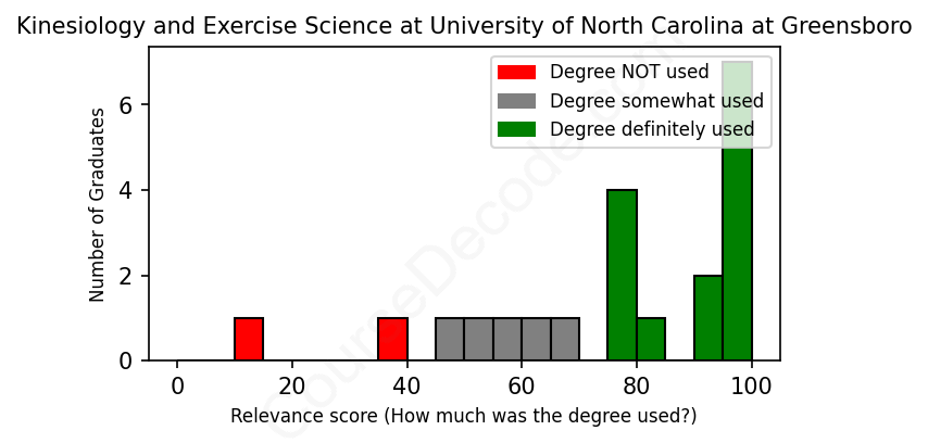 The verdict? Above average. Overall, with an average relevance score of 76%, Kinesiology and Exercise Science graduates from University of North Carolina at Greensboro have a higher likelihood (+9%) of finding work in this field compared to the average graduate across all fields: