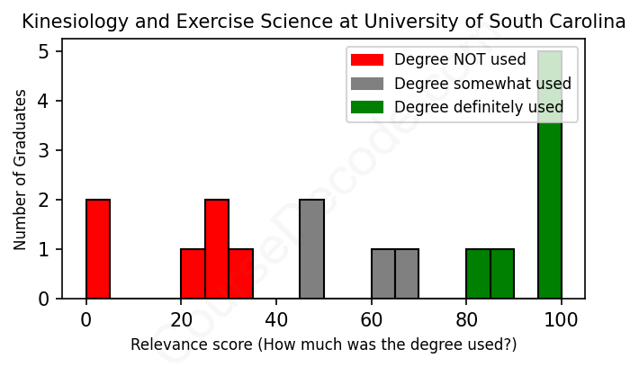 The verdict? Below average. Overall, with an average relevance score of 58%, Kinesiology and Exercise Science graduates from University of South Carolina have a lower likelihood (-9%) of finding work in this field compared to the average graduate across all fields: