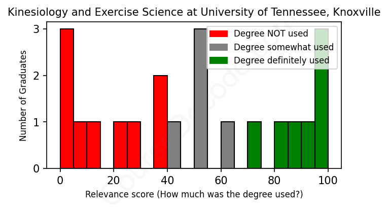 The verdict? Significantly below average. Overall, with an average relevance score of 49%, Kinesiology and Exercise Science graduates from University of Tennessee, Knoxville have a much lower likelihood (-18%) of finding work in this field compared to the average graduate across all fields: