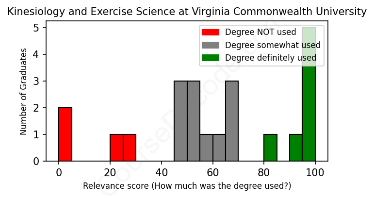 The verdict? Below average. Overall, with an average relevance score of 60%, Kinesiology and Exercise Science graduates from Virginia Commonwealth University have a lower likelihood (-7%) of finding work in this field compared to the average graduate across all fields: