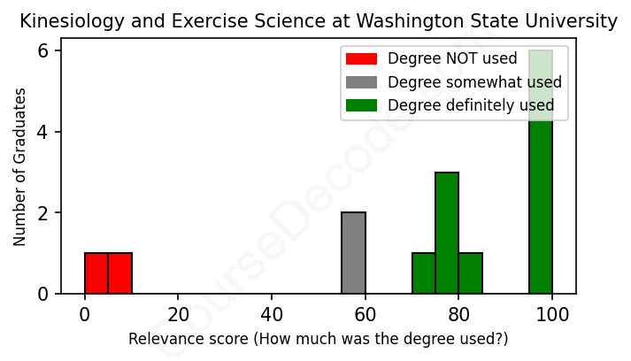 The verdict? Above average. Overall, with an average relevance score of 73%, Kinesiology and Exercise Science graduates from Washington State University have a higher likelihood (+6%) of finding work in this field compared to the average graduate across all fields: