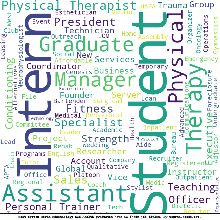 Here is a visual representation of the most common words in job titles for Kinesiology and Health graduates (this is across all Kinesiology and Health graduates we've analyzed, not just those who went to Iowa State University):