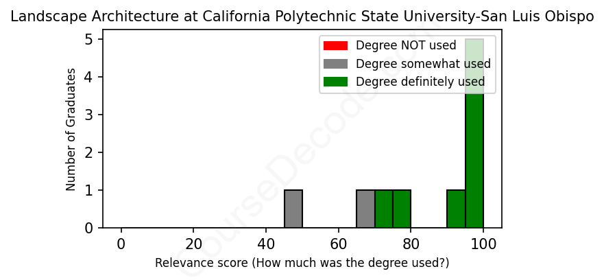 The verdict? Significantly above average. Overall, with an average relevance score of 84%, Landscape Architecture graduates from California Polytechnic State University-San Luis Obispo have a much higher likelihood (+17%) of finding work in this field compared to the average graduate across all fields: