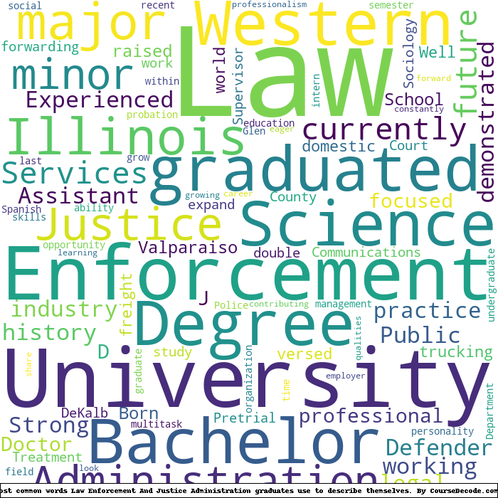 Here is a visual representation of the most common words seen in the "about" section of LinkedIn profiles who have a Bachelor degree in Law Enforcement And Justice Administration (this is across all Law Enforcement And Justice Administration graduates we've analyzed, not just those who went to Western Illinois University). This may or may not be useful: