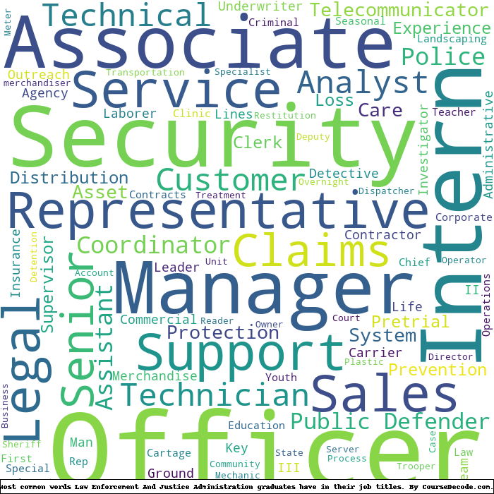 Here is a visual representation of the most common words in job titles for Law Enforcement And Justice Administration graduates (this is across all Law Enforcement And Justice Administration graduates we've analyzed, not just those who went to Western Illinois University):