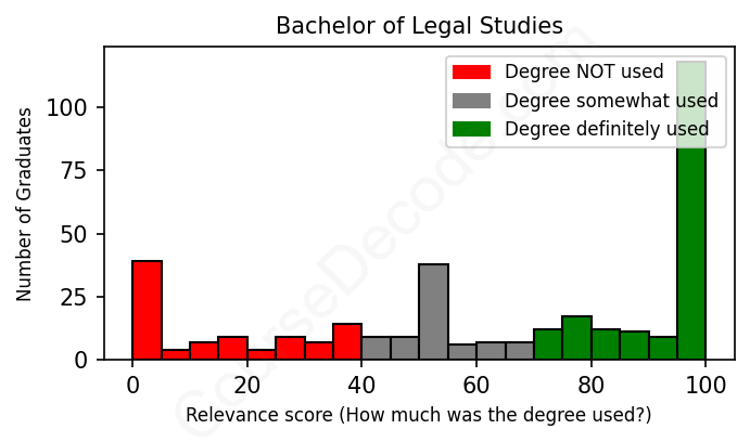 The verdict? Slightly below average. Overall, with an average relevance score of 63%, Legal Studies graduates have a slightly lower likelihood (-4%) of finding work in this field compared to the average graduate across all fields: