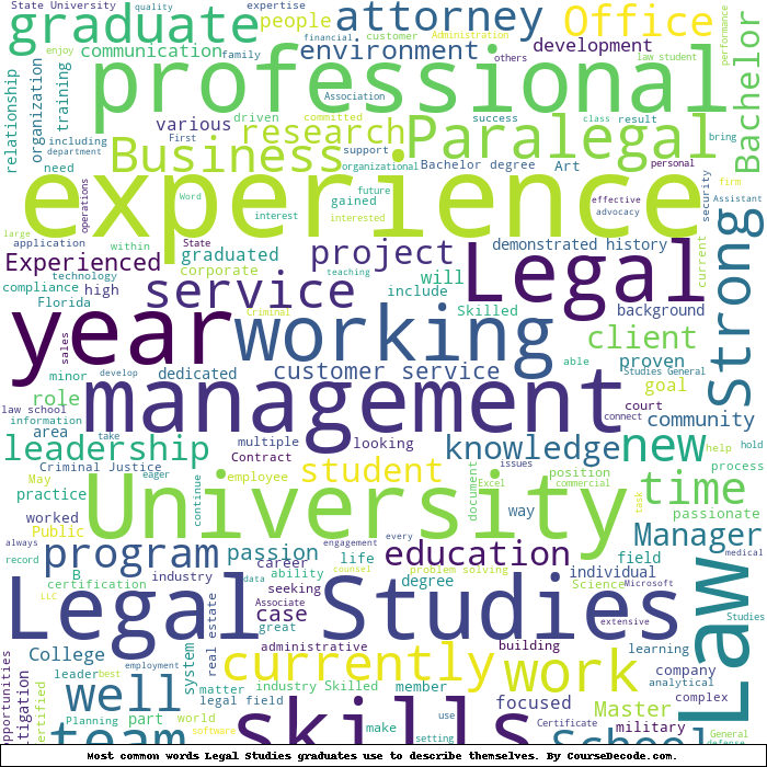 Here is a visual representation of the most common words seen in the "about" section of LinkedIn profiles who have a Bachelor degree in Legal Studies. This may or may not be useful: