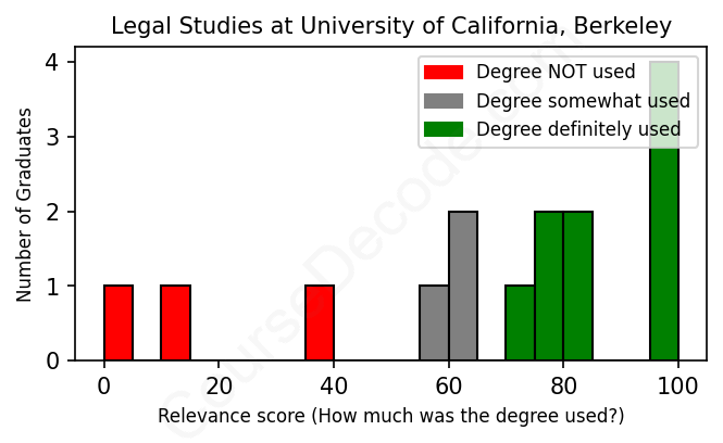 The verdict? On par with the average. Overall, with an average relevance score of 67%, Legal Studies graduates from University of California, Berkeley have about the same likelihood of finding work in this field as the average graduate across all fields: