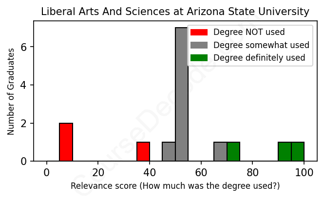 The verdict? Significantly below average. Overall, with an average relevance score of 52%, Liberal Arts And Sciences graduates from Arizona State University have a much lower likelihood (-15%) of finding work in this field compared to the average graduate across all fields: