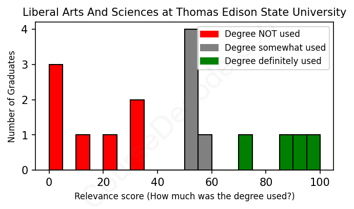 The verdict? Bad. Overall, with an average relevance score of 44%, Liberal Arts And Sciences graduates from Thomas Edison State University have a substantially lower likelihood (-23%) of finding work in this field compared to the average graduate across all fields: