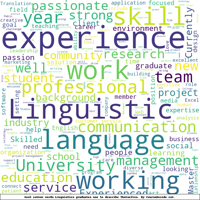 Here is a visual representation of the most common words seen in the "about" section of LinkedIn profiles who have a Bachelor degree in Linguistics. This may or may not be useful: