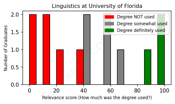 The verdict? Bad. Overall, with an average relevance score of 44%, Linguistics graduates from University of Florida have a substantially lower likelihood (-23%) of finding work in this field compared to the average graduate across all fields: