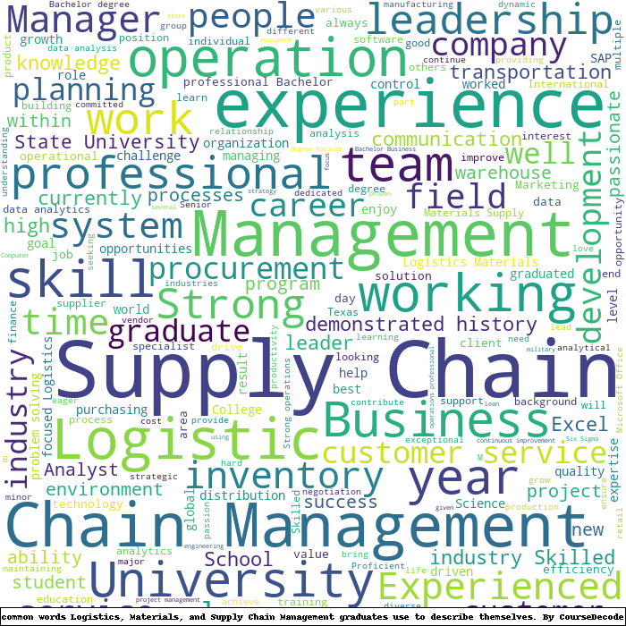 Here is a visual representation of the most common words seen in the "about" section of LinkedIn profiles who have a Bachelor degree in Logistics, Materials, and Supply Chain Management. This may or may not be useful: