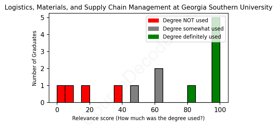 First, some facts. Of the Logistics, Materials, and Supply Chain Management graduates from Georgia Southern University we've analyzed , here's how many have used (or NOT used) their degree in their career: