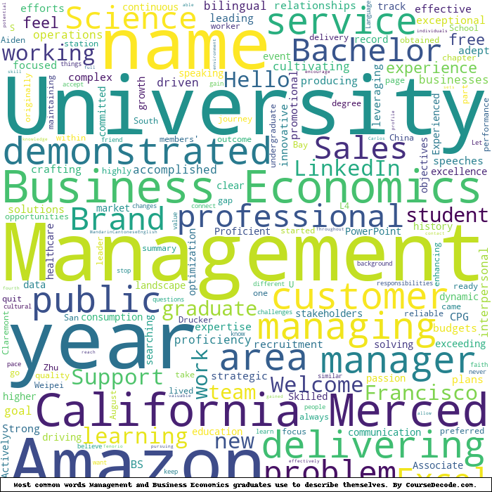Here is a visual representation of the most common words seen in the "about" section of LinkedIn profiles who have a Bachelor degree in Management and Business Economics (this is across all Management and Business Economics graduates we've analyzed, not just those who went to University of California, Merced). This may or may not be useful: