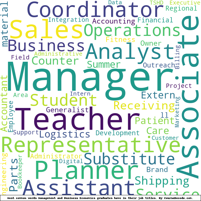 Here is a visual representation of the most common words in job titles for Management and Business Economics graduates (this is across all Management and Business Economics graduates we've analyzed, not just those who went to University of California, Merced):