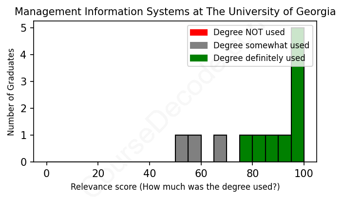 The verdict? Significantly above average. Overall, with an average relevance score of 84%, Management Information Systems graduates from The University of Georgia have a much higher likelihood (+17%) of finding work in this field compared to the average graduate across all fields: