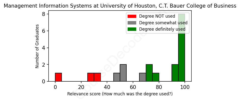 The verdict? Above average. Overall, with an average relevance score of 73%, Management Information Systems graduates from University of Houston, C.T. Bauer College of Business have a higher likelihood (+6%) of finding work in this field compared to the average graduate across all fields: