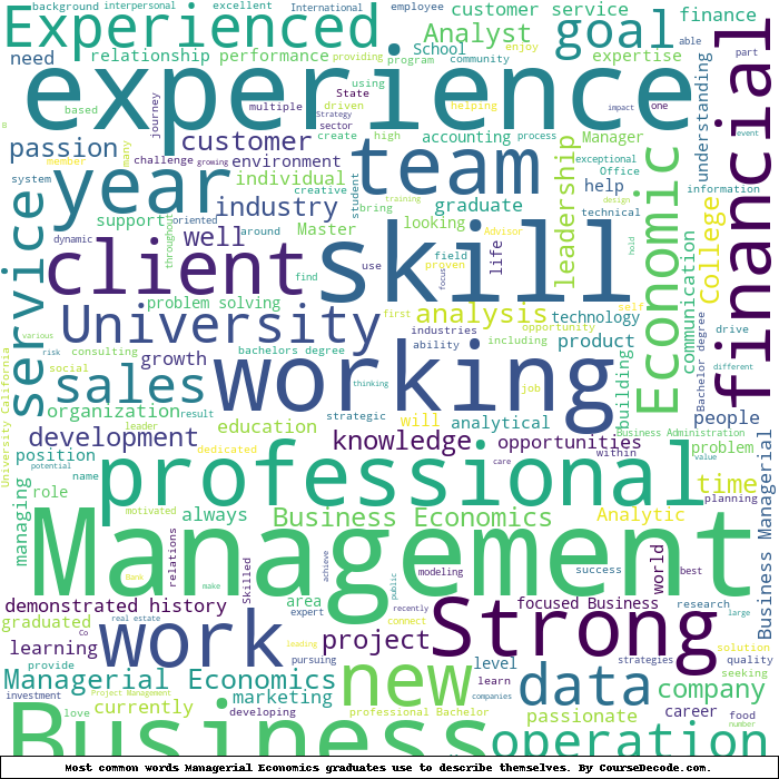 Here is a visual representation of the most common words seen in the "about" section of LinkedIn profiles who have a Bachelor degree in Managerial Economics. This may or may not be useful: