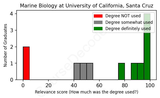 The verdict? Slightly below average. Overall, with an average relevance score of 65%, Marine Biology graduates from University of California, Santa Cruz have a slightly lower likelihood (-2%) of finding work in this field compared to the average graduate across all fields: