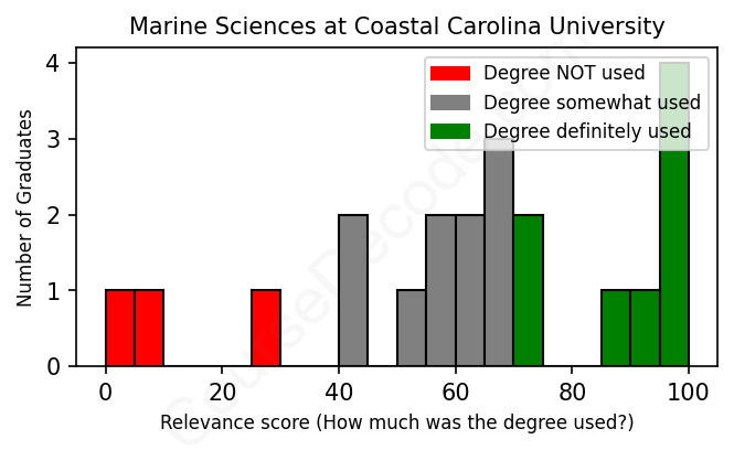 The verdict? Slightly below average. Overall, with an average relevance score of 62%, Marine Sciences graduates from Coastal Carolina University have a slightly lower likelihood (-5%) of finding work in this field compared to the average graduate across all fields: