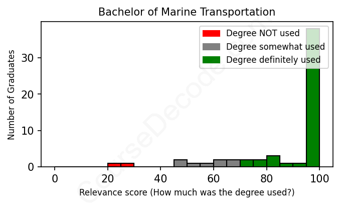 The verdict? Significantly above average. Overall, with an average relevance score of 87%, Marine Transportation graduates have a much higher likelihood (+20%) of finding work in this field compared to the average graduate across all fields: