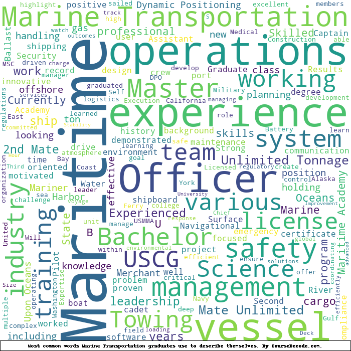 Here is a visual representation of the most common words seen in the "about" section of LinkedIn profiles who have a Bachelor degree in Marine Transportation. This may or may not be useful: