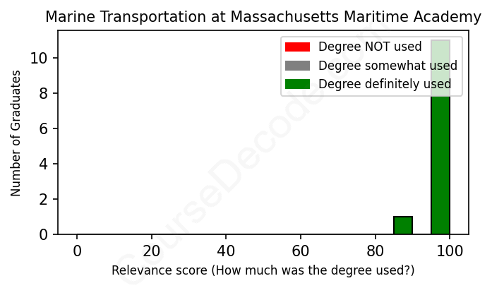 The verdict? Fantastic! Overall, with an average relevance score of 98%, Marine Transportation graduates from Massachusetts Maritime Academy have an exceptionally higher likelihood (+31%) of finding work in this field compared to the average graduate across all fields: