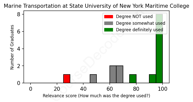 The verdict? Significantly above average. Overall, with an average relevance score of 80%, Marine Transportation graduates from State University of New York Maritime College have a much higher likelihood (+13%) of finding work in this field compared to the average graduate across all fields: